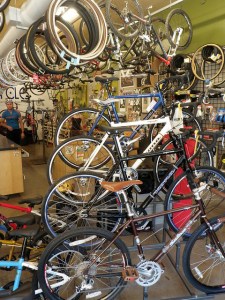 The hotel clerk was right. As I approached the shop, I saw that a group ride was just getting going (or ending, I couldn’t tell). When I walked inside, the first thing I noticed was that the bike mechanic was a WOMAN. Yes!