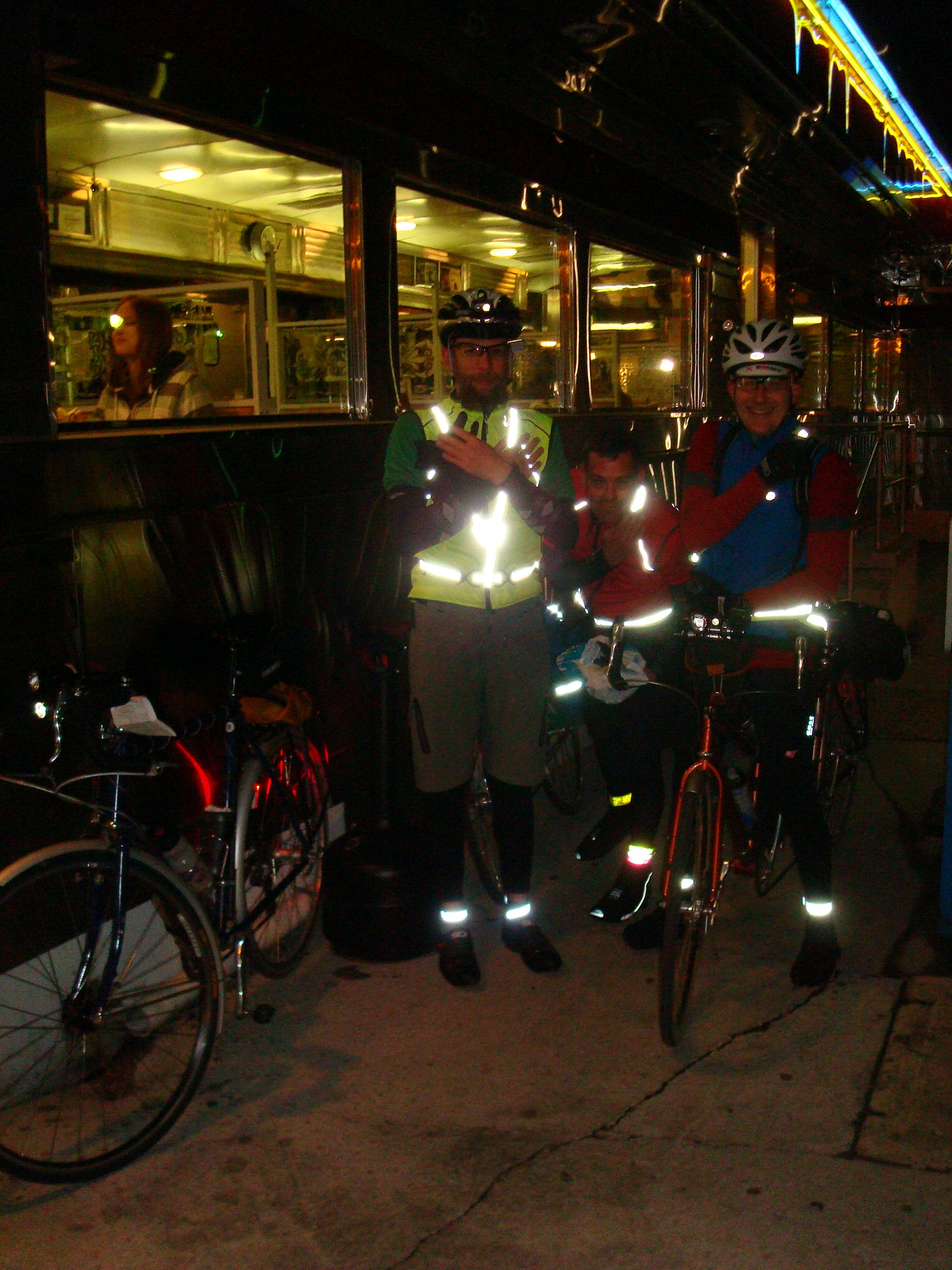 This picture of our fleche team was taken in Gettysburg in the dark of night (probably around 11:00 p.m.), which requires the randonneur salute to block as much reflective gear as possible. I like the diner lighting in the background, the bit of reflective material that caught the lens, and the team’s expressions.