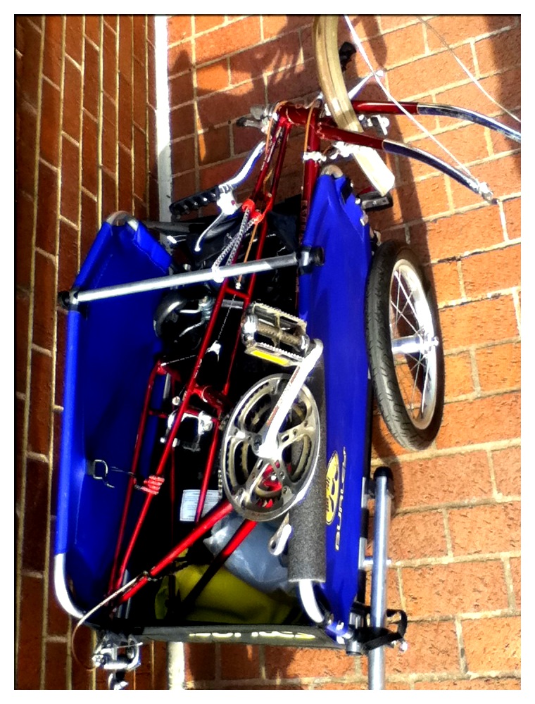 Before we go, though, I would like to share that we are putting the Bridgestone MB-4 to work. This morning, Felkerino hitched the Burley trailer to it and rode off to retrieve a 1980 Nishiki mixte frame that someone gave us.