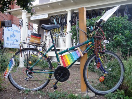 A couple of weeks ago, Felkerino and I met up with a few friends and pedaled our way out of the District all the way to Takoma Park, Maryland, to tour the reCYCLE Art of Bike Project sponsored by the Old Takoma Business Association (OTBA). This bike-centric project consists of seven sculptures composed of (guess?) bike parts.