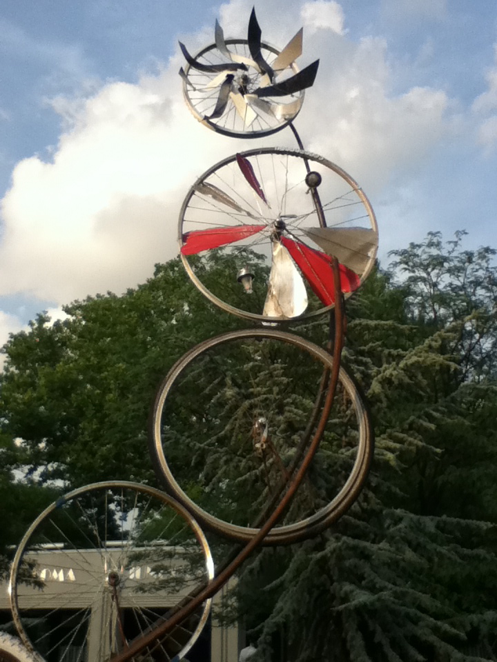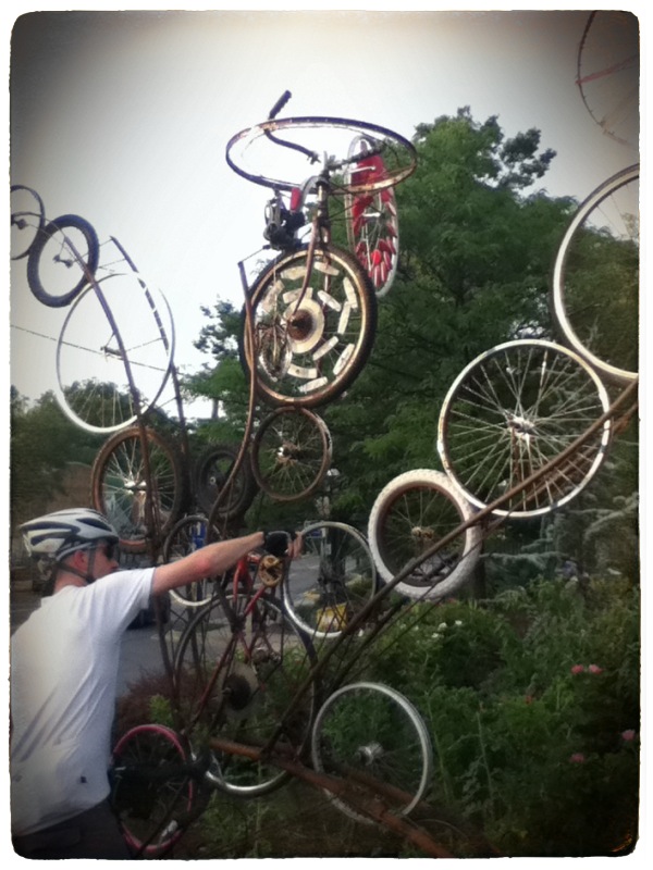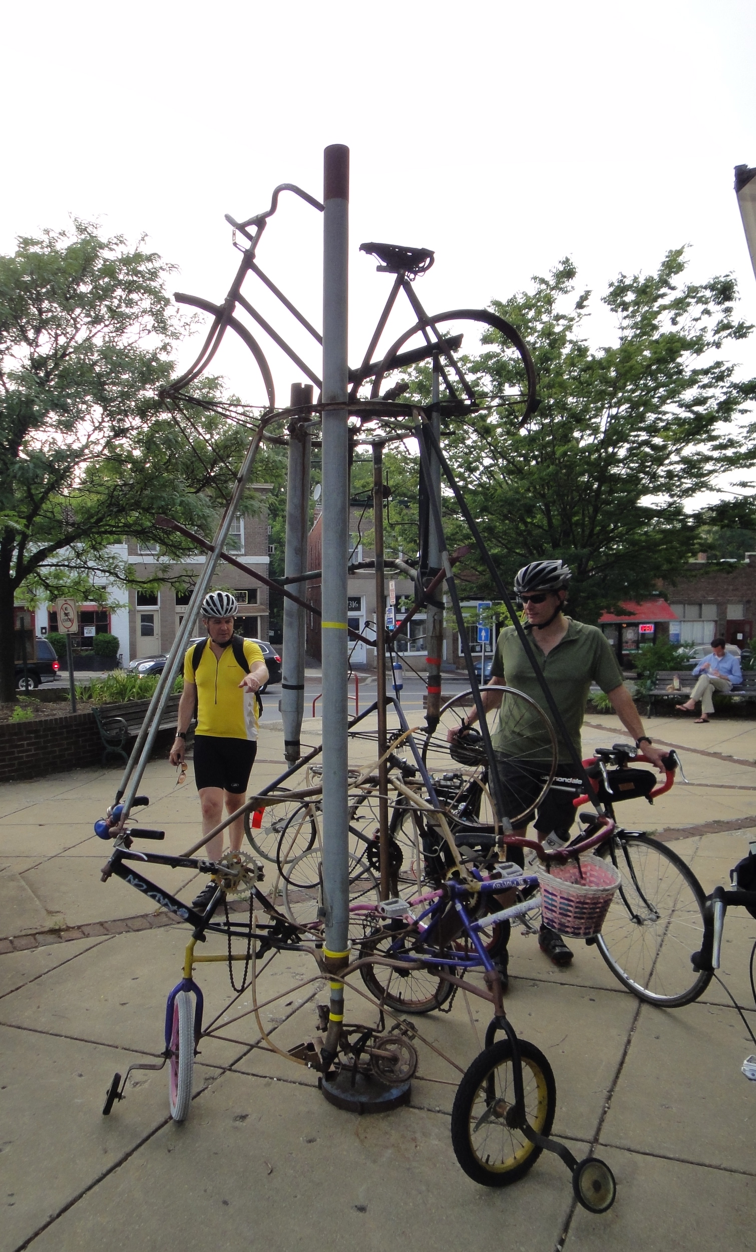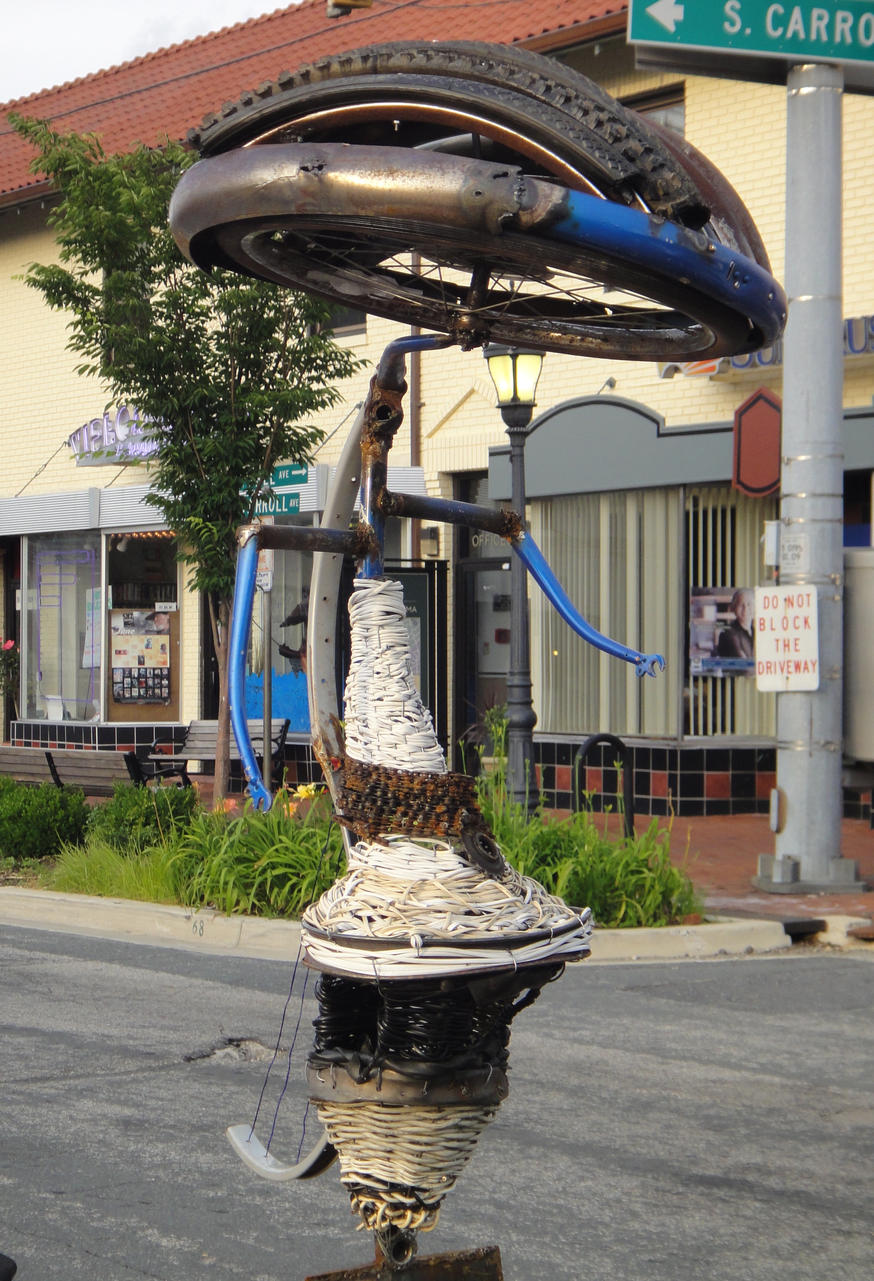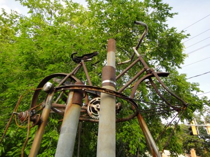 All sculptures are constructed primarily of bike parts and each one has its own personality and feel. This exhibit goes from now until October, at which time the pieces will be sold at the Takoma Park Street Festival.