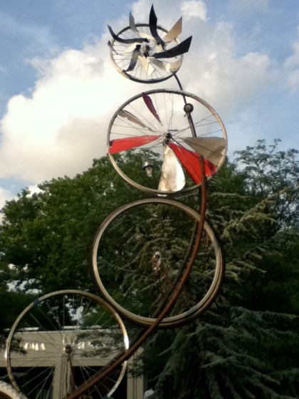 Abstract, upbeat, prickly, and bold. If I was a bike sculpture going shopping, I might look like this except my head would be smaller and my fork arms longer.