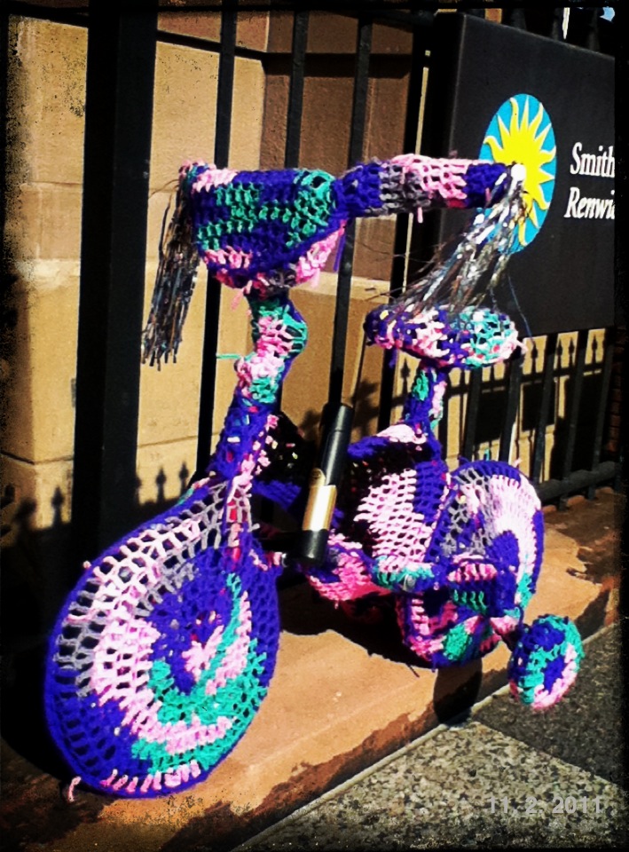 Thank you for writing about the bike. Although this post was up many months earlier, it was just brought to our attention today by Olek herself. In honor of the discovery of your post, we have put the bike out this afternoon. Thank you for taking the time to write about us, and we hope you will post more about Olek and the Renwick Gallery the closer we get to the opening of 40 Under 40: Craft Futures on July 20, 2012