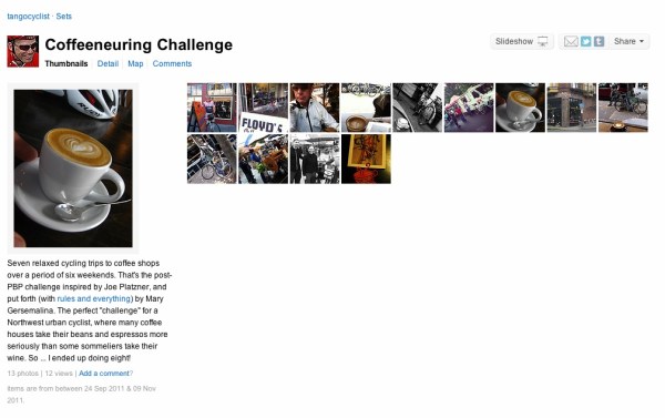 Bill A. of Oregon named all of his coffeeneuring destinations “controles,” a reference to the required stops randonneurs must make on an organized randonneuring event. Bill completed eight rides over the seven weeks of the challenge, and continued coffeeneuring even after his successful Coffeeneuring Challenge completion. Rumour has it he’s in pursuit of a C-52, which is a visit to one coffee shop a week over the course of a year. Coffeeneuring gone wild!