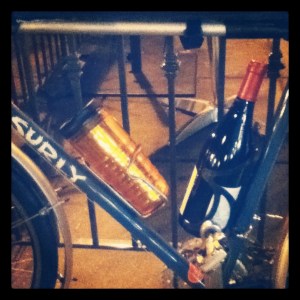 Both the Surly and the Quickbeam have two bottle cages. One is a steel bottle cage from I don’t know where, and the other is a plastic Kleen Kanteen cage. I often use the steel cage to hold my coffee and I use the plastic cage for grocery store purchases, lately wine or almond butter. I don’t like to have glass rub directly against steel, which adds to the appeal of the plastic Kleen Kanteen cage. It has proven hardy, yet flexible, and is an excellent holster for a bottle of vino or a medium-sized jar.