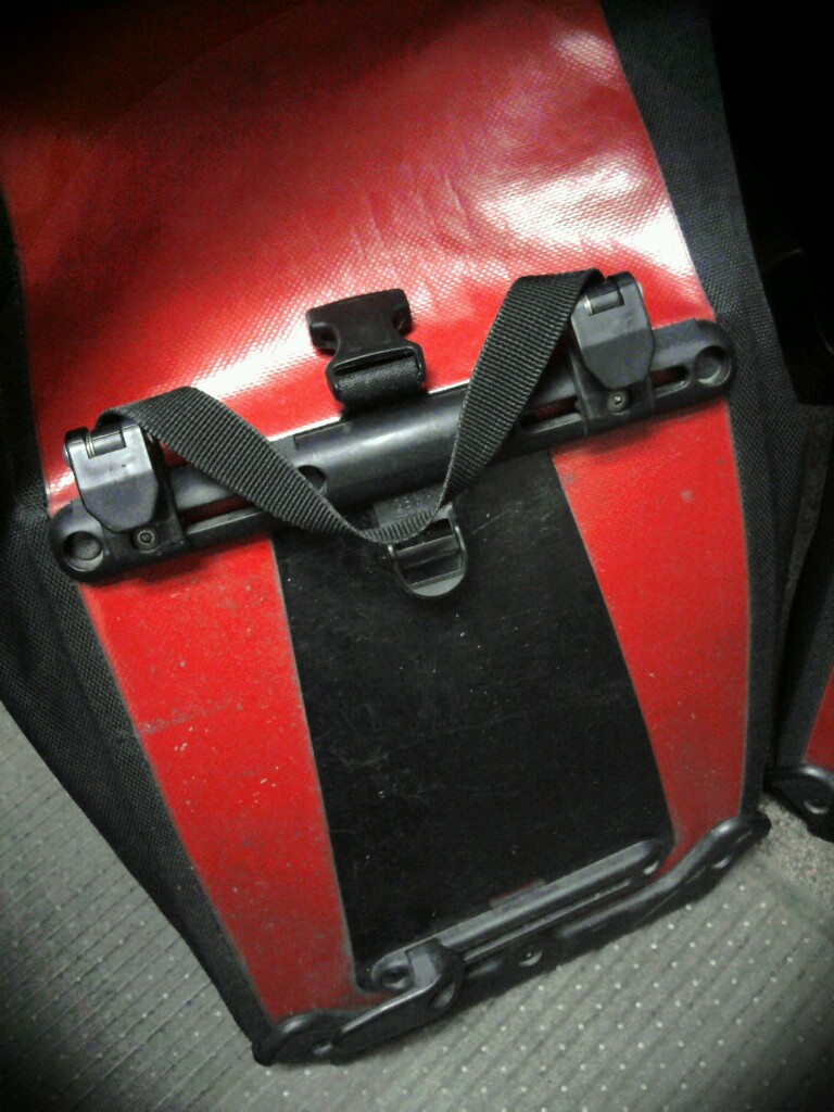Usually, when I ride the Surly I carry at least one pannier, sometimes two. My panniers of choice for town riding are the Ortlieb front-roller classics. I love love love them.