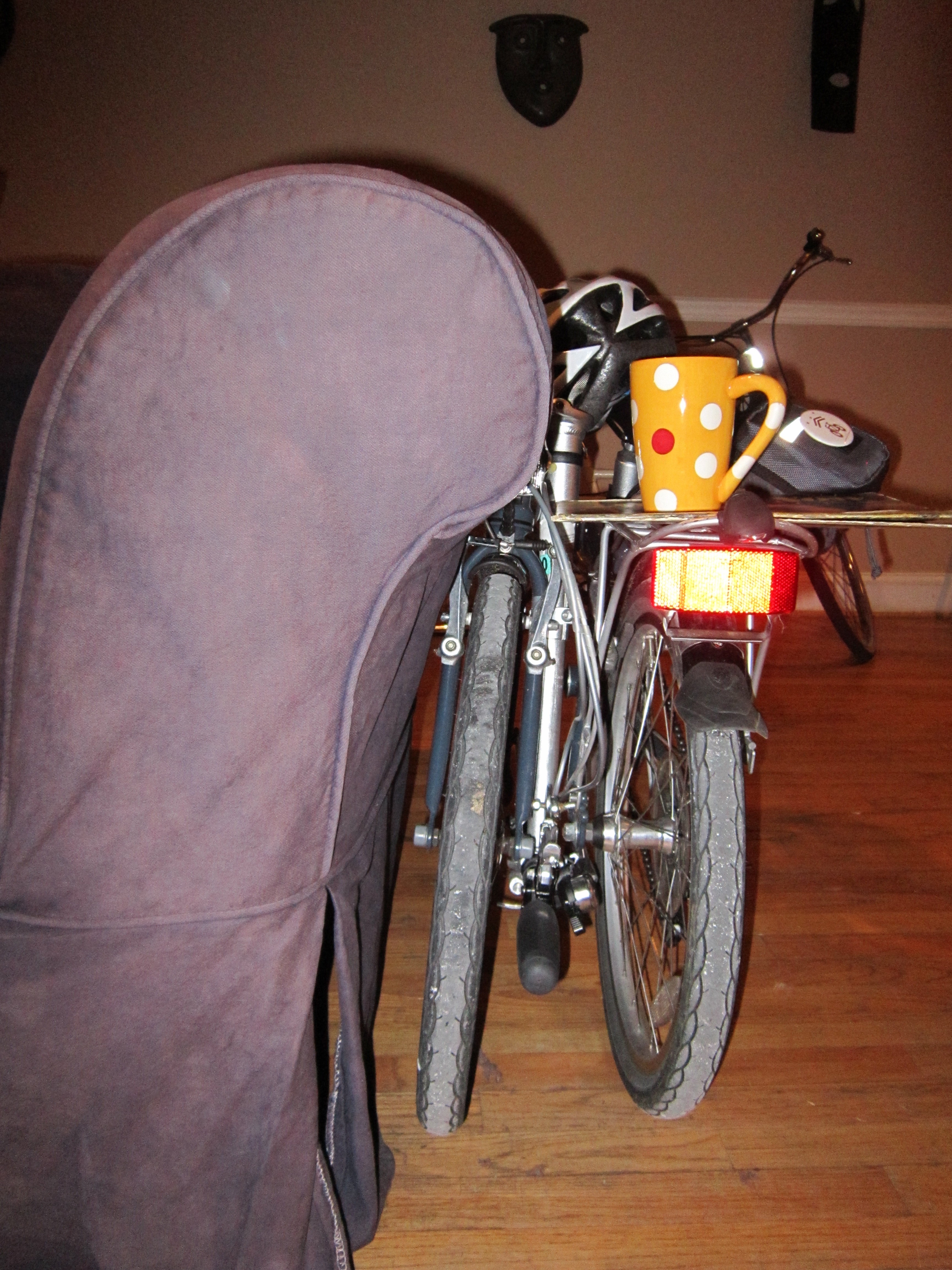 I got the Dahon when I was bouncing around between tiny dorm rooms and tinier apartments. It’s always been able to tuck neatly into a closet or corner. I have much more space at home now, but I do like that the folder means I can park it inside at work – it fits under my desk in my cube. And, when it’s at rest at home, we can use it as a coffee table!