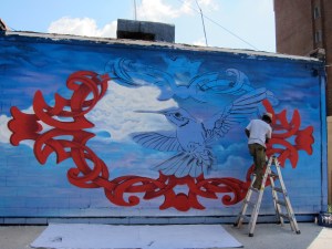 On this ride, it happened as a small group of us watched an artist work quietly on his mural. The artist painted, we paused in the driveway in front of his mural, and quietly watched. Peaceful. Sunny. Perfect.