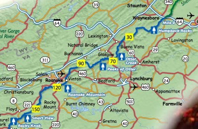 Below is a map of the segment we toured, which extended from Floyd to the northern edge of the Parkway in Waynesboro, Virginia. As you can see, we covered slightly more than 150 miles of the parkway.
