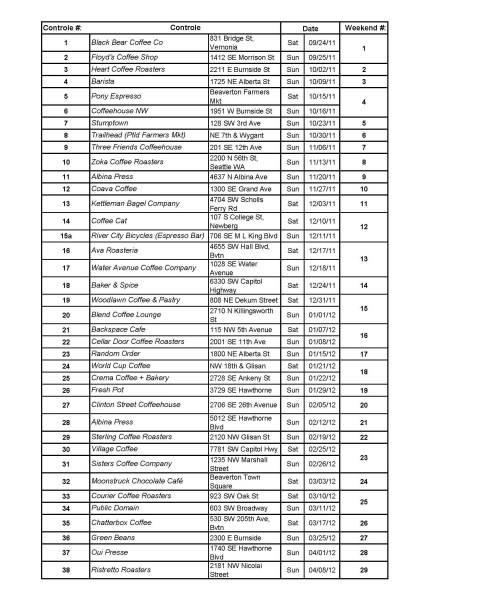As you can see, the majority of Tangobiker’s coffeeneuring took place around Portland. However, he did extend his radius a couple of times to coffeeneur at Zoka Coffee Roasters in Seattle, Washington, and at Caffe Artigiano in Vancouver, British Columbia… in Canada! International Coffeeneuring!