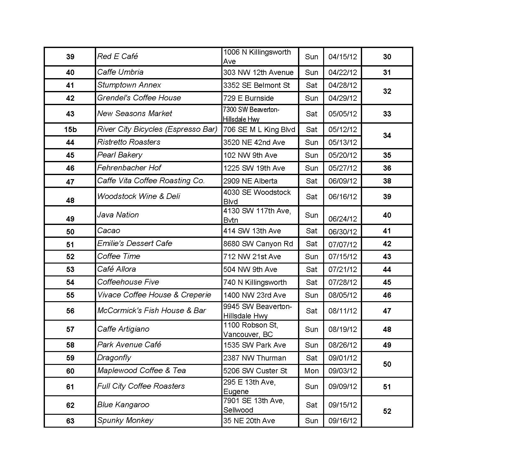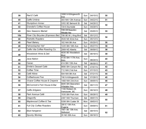 The spreadsheet below shows the 63 distinct places where Tangobiker coffeeneured.