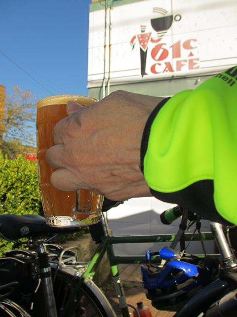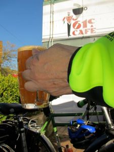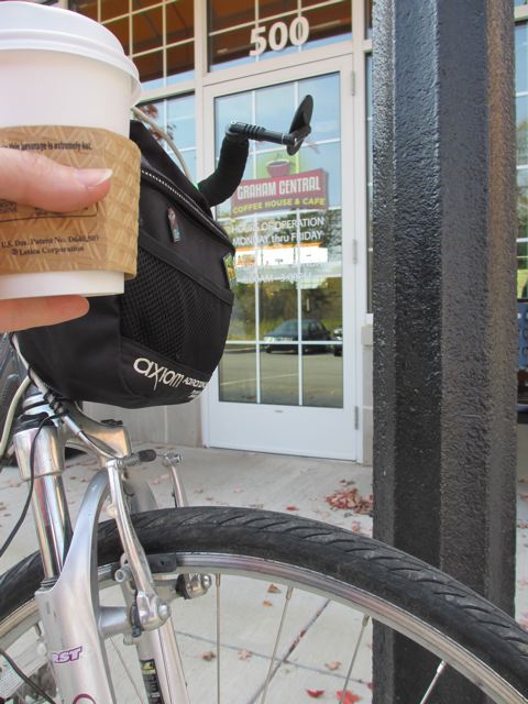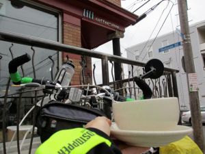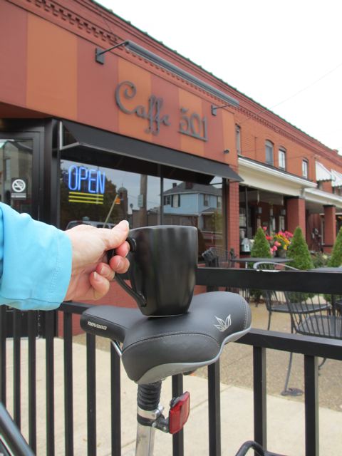 As I was making my way back to a road that I knew would get me where I wanted to go an older gentleman stopped to ask me what I was inspecting. Excuse me? He must not see many cyclists in his neighborhood totally lit up with blinkies and neon reflective vests because he assumed I was inspecting a public works project or checking up on the garbage collection or something. Too funny. While he was telling me his life story (I had a hard time moving on here) he mentioned there was a coffee shop “just down at the bottom of the hill.” Since I had my plan I didn’t ask for more details.