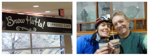 Once that was done, we donned our rain gear for our coffee run. Iโm not a fan of riding in the rain, so we opted for the closest coffee shop โ a Brew HaHa! at Christiana Hospital. We rode 2.5 miles in the rain, stopped and had our coffees, then rode another 2.5 miles in the pouring rain back home. Hurricane Sandy would keep us stranded inside for 2 days. We were fortunate to get out for our short bike ride.