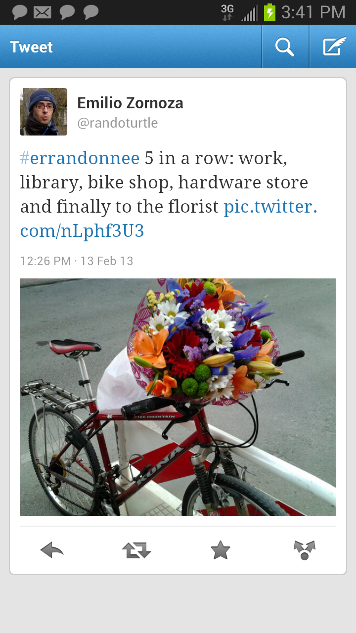 • Robert Kerner joined the Errandonnee action and, at least for the moment, is using a lovely Co-Motion as his errandeur steed of choice. Bike envy! A rider from New York state, he’s also dealing with snow, and said that putting on the heavy snow tires causes an adverse psychological reaction about one’s perceived fitness. Just hang in there still Spring arrives!