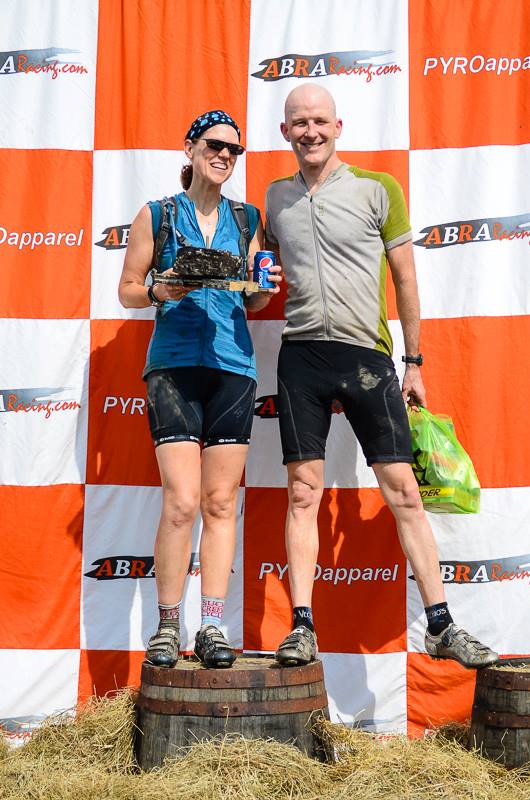 Felkerino and I rode it on our “lead sled,” i.e., the Cannondale mountain tandem, and since we were the only tandem team to ride (and finish), we made the podium! We were the podium! We won the Hilly Billy Roubaix piece of coal, two bottles of wine, some chain lube, and a few other trinkets and treasure for our efforts.
