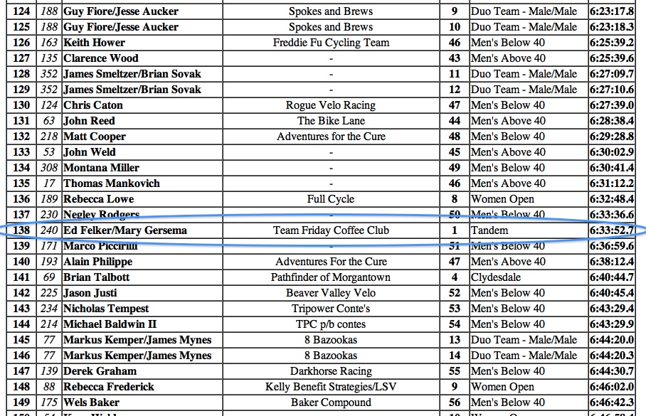 The area outside of Morgantown was a gorgeous, if unrelenting, place to ride and Felkerino and I had an amazing day on two wheels. We received so much support and enthusiasm from volunteers and other riders for our tandem effort. Thanks to the organizers and everybody who made sure we stayed on course and cheered us on. You kept us going through it all.