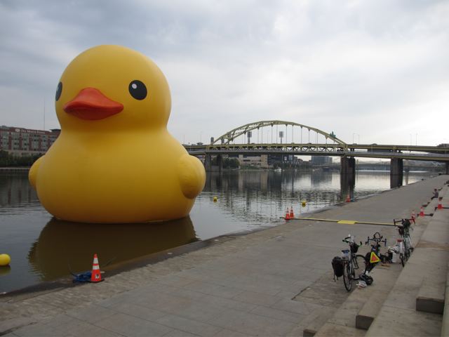 We had started our ride at the usual trailhead along the Ohio River and rode toward town. Through Point State Park and past the giant duck, whose days are numbered unless the new campaign to extend his stay is successful.