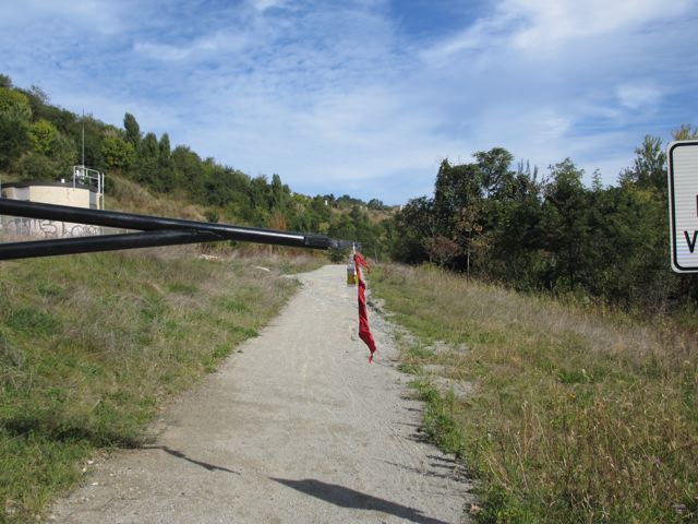 It was a struggle getting up that one, and at the top we saw a pack of large dogs coming up the other side unleashed. Luckily their humans were just around the bend behind them and they were all friendly, well behaved animals. Continuing down the trail we almost literally ran into a black, iron, bar gate that was across the trail.