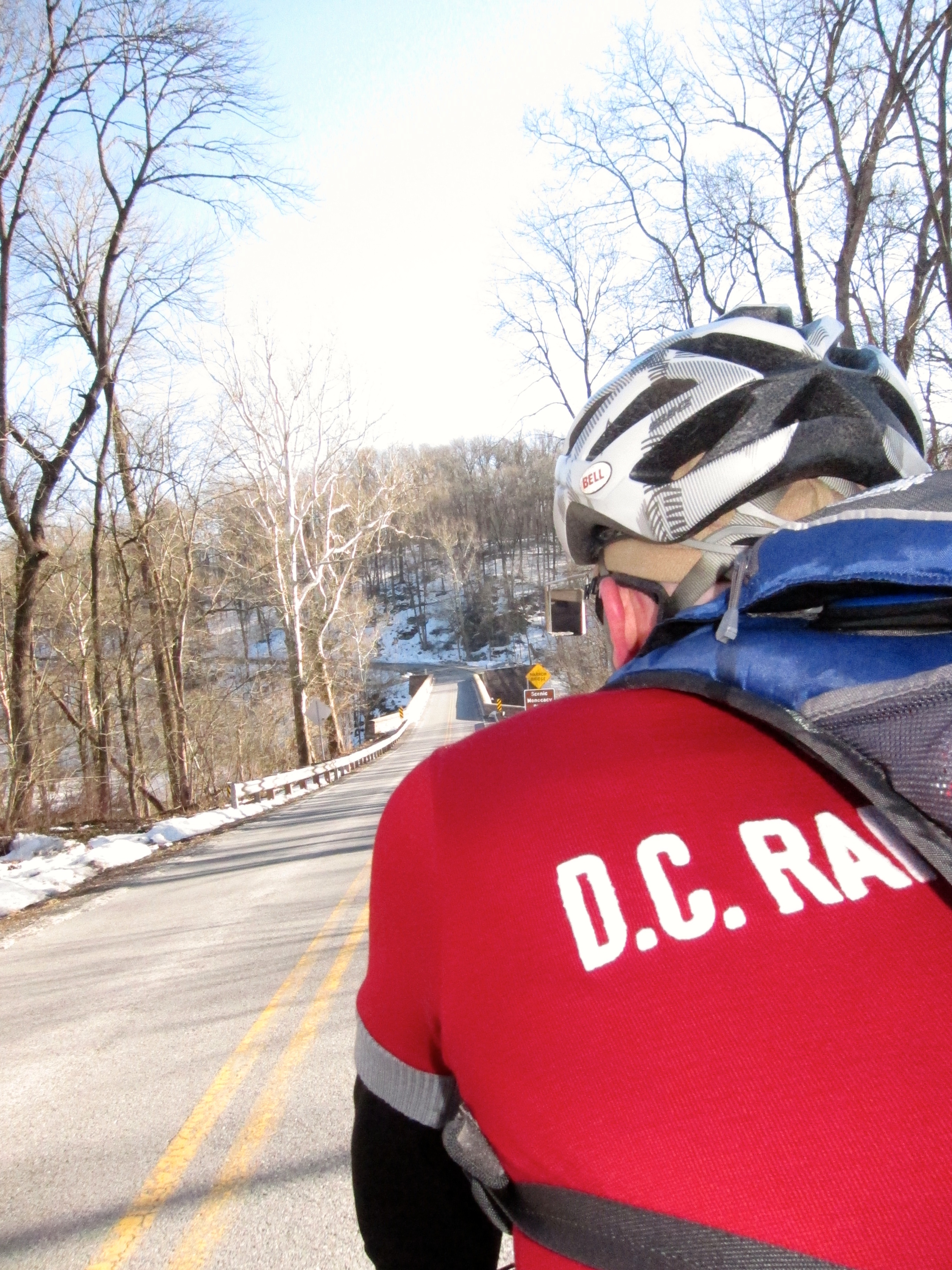 The rolling morning miles took us through some cold dips, and we pedaled cautiously over a few icy patches remaining on some segments the sun has trouble reaching.