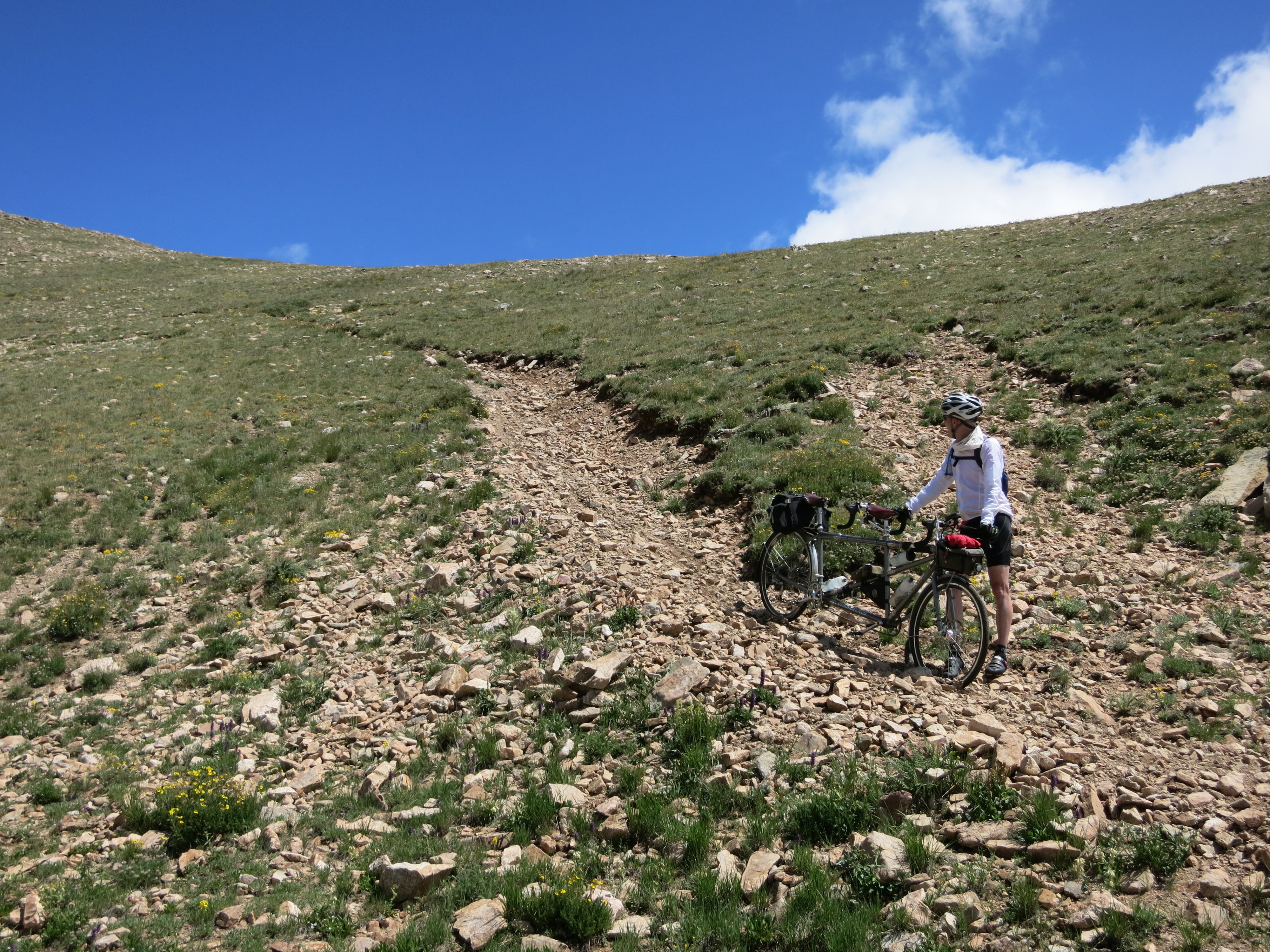 7. It pays to travel light, in so many ways. Felkerino and I took one jersey, a pair of sunsleeves, and two pairs of cycling shorts each. We both had one pair of shorts and a shirt for evenings and non-cycling days. We carried our rainjackets and helmet covers, as well as our tools, tubes, patch kit, a spare tire, and a couple of wrenches. Toiletries were minimal, but did the job. I indulged and brought knee warmers, which I used a couple of mornings and during a rainy descent. Keeping our gear light meant we had less to carry over the big passes, and this really helped us out for our hike over Rollins Pass.