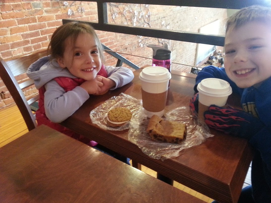 Tanzanian Peabody drip for me, cocoa for the kiddos to share, and a Cookie As Big As My Face for all three of us.