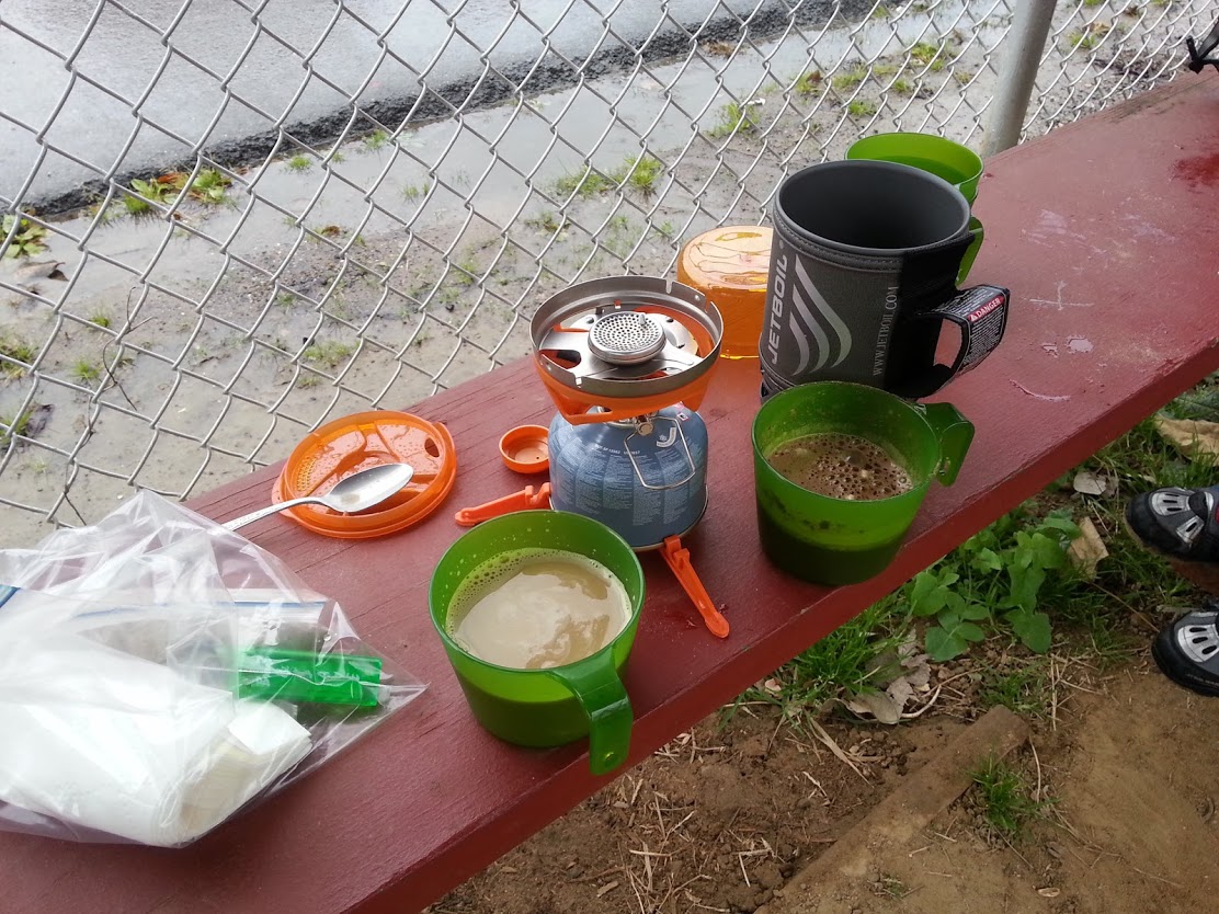 This was our inaugural use of the Jetboil stove I just picked up at REI; I was quite pleased with how rapidly it boiled our water, less pleased with how poorly the spark igniter worked. All in all, though, it could have been far worse.