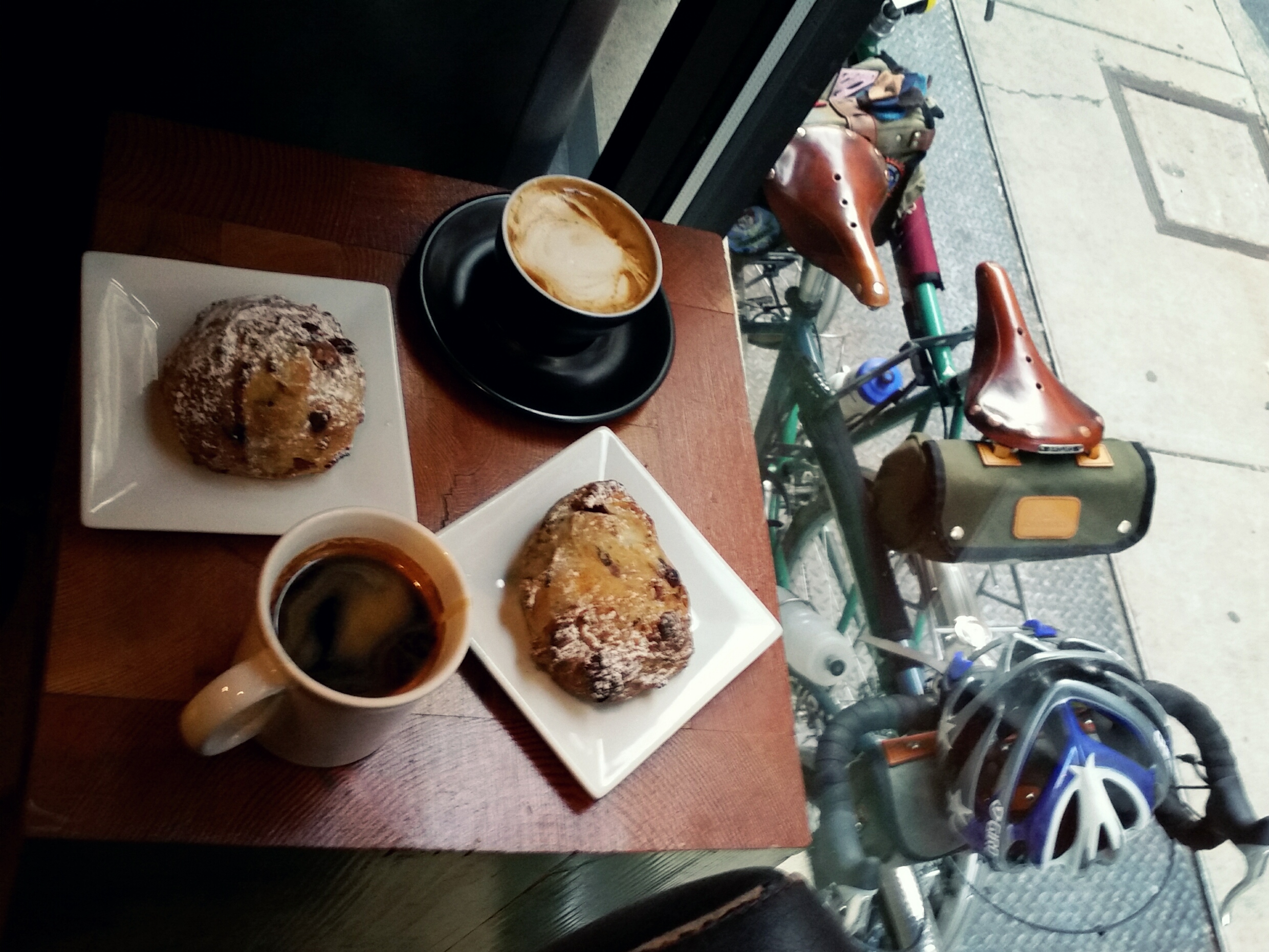 We rode our single bikes from a Philadelphia suburb over the Schuylkill River Trail to Volo Coffeehouse in Manayunk. Good coffee, sweet pastries, this shop is apparently a popular stop for the weekend group rides around the city.