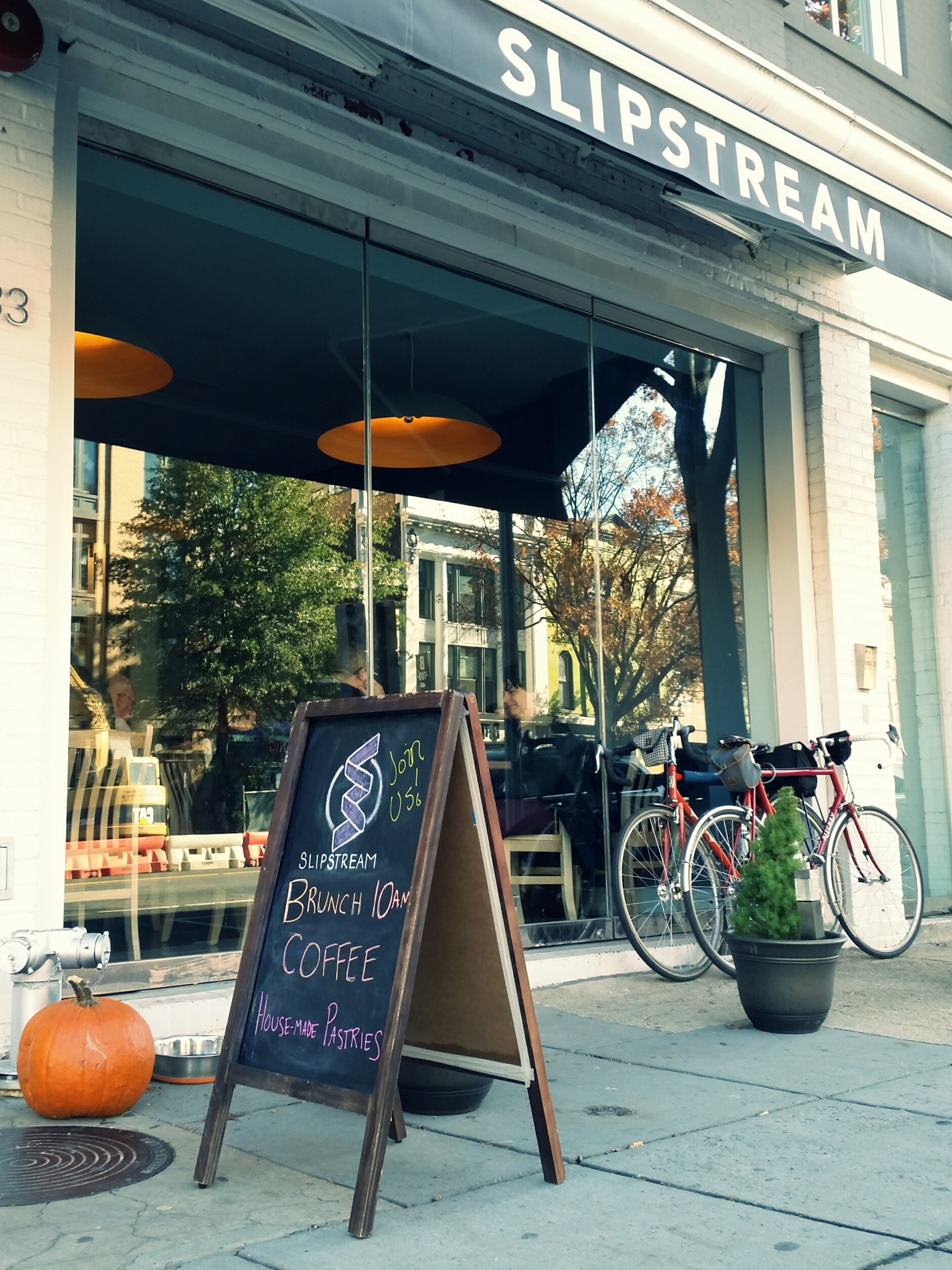 In the interest of trying something new, Felkerino and I headed up 14th Street to try out Slipstream coffee. This shop was a mixed bag, but ultimately I’d call it too much work for a cup of coffee. There was no bike parking outside the shop so we ended up leaning the bike against the large glass shop window.