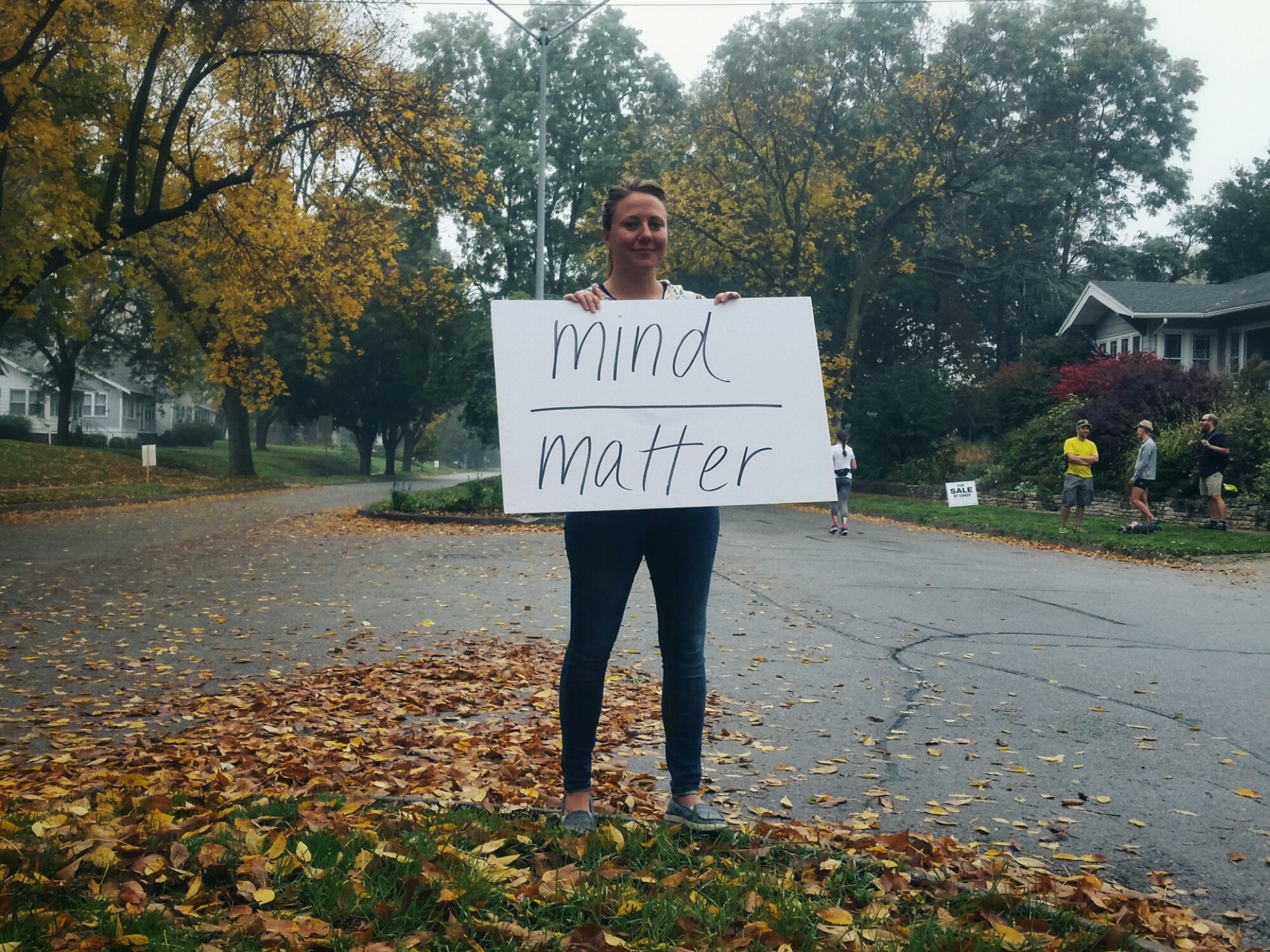A spectator sign early in the run served as my marathon mantra – “Mind Over Matter.” Fatigue lingered in the legs from my earlier marathon effort two weeks ago, but I knew if I did not allow that too much space in my head – and as long as my legs kept turning over – I would make it.