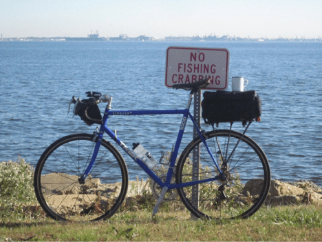 The city of Hampton divides into four quadrants. Today’s ride covers the remaining bicycle routes in the Southeast quadrant. Mostly urban, many traffic lights and heavy traffic. Ninety percent of the drivers are careful and considerate, but the ten percent require close watching. The bike routes all suffer from poor paving, inadequate or non-existent marking and sometimes just not enough room on the pavement. The ride today took in the Veteran’s Hospital, Hampton University and sections of Fox Hill and Harris Creek. Coffee stop was at the mouth of the Hampton River, looking across to Blackbeard’s Point.