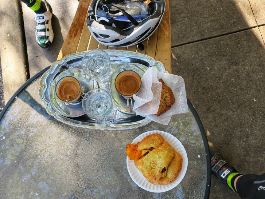 Not all the eating occurs on the bike though. Another aspect of the ride I look forward to is eating off the bike. It’s good to feed your 400K face when you’re not pedaling, too. For this ride, we prepared to stop at mile 75 (a sitdown indulgence of espresso and ham and cheese croissants), mile 112 (cheese sandwiches at Sheetz), mile 164 (another cheese sandwich from Sheetz), with our last stop coming at mile 212 (a V-8, Lifesavers, and only 40 miles to go!).