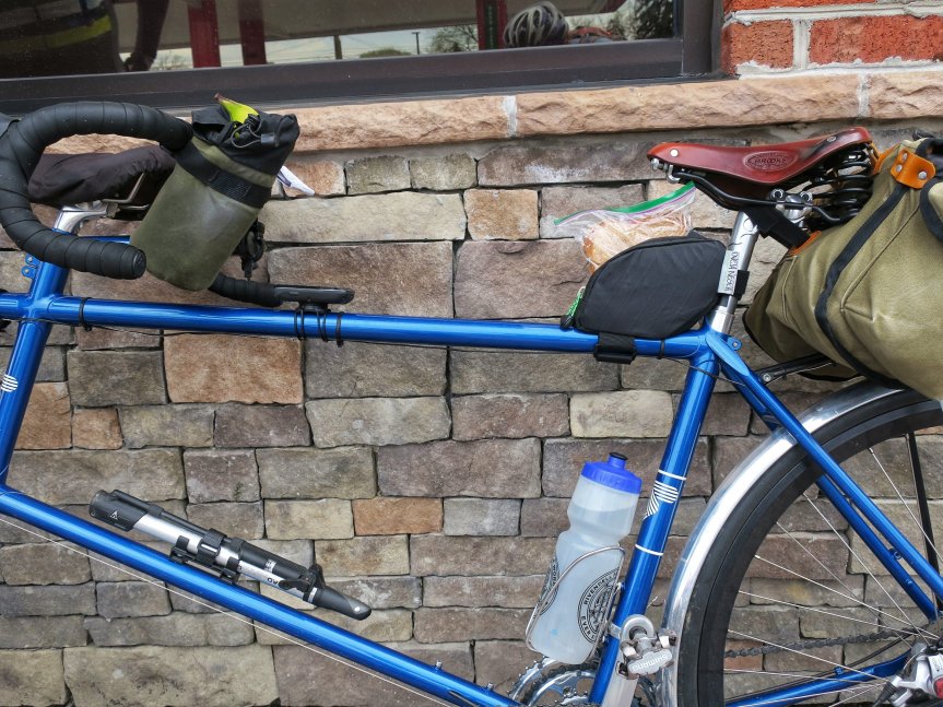 This year I purchased a Randi Jo Fabrications bartender bag and Felkerino suggested I try an Oveja Negra top tube bag. These have been ideal for stowing bananas as well as PB&J (or almond butter & J) sandwiches that I chew on during rides. I find sandwiches far more appealing than energy bars, and they don’t take much time to prepare the night before a ride. And I’m not fishing around awkwardly in my back pocket trying to grab whatever I’ve stashed there.