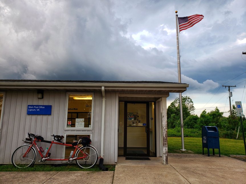 We all rode the last 100K together and made fairly good time. We avoided the majority of predicted storms, but when lightning cracked just a second away from us, we took shelter in a very conveniently placed U.S. Post Office for about 10 minutes. I pulled out the radar app and could see the storms were passing us by. We were pretty fortunate in this regard.