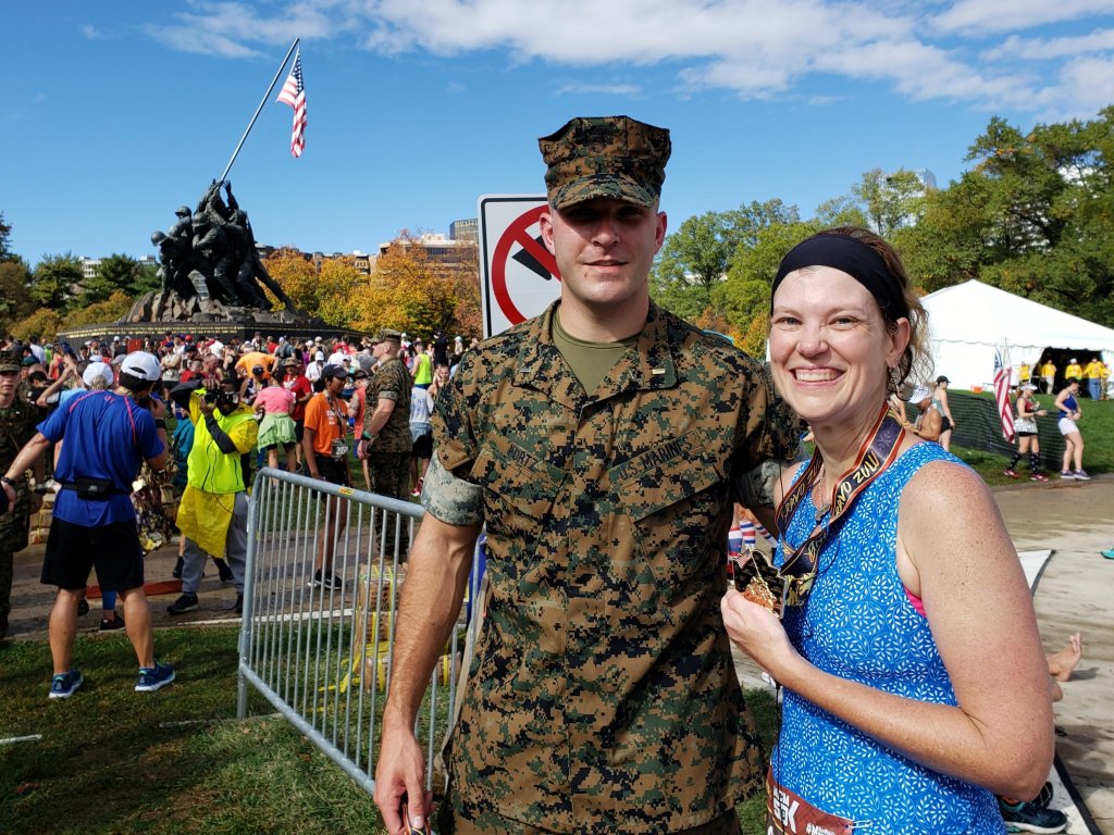 After 5 hours and 41 minutes of running, I crossed the finish. A Marine gave me my 50K medal, and I asked for a photo with him. I snagged a couple of bananas in the finishers zone, and headed over to Arlington Cemetery to meet Felkerino. Throughout my half-mile walk to connect with him, people offered congratulations. My first 50K was officially on the books.