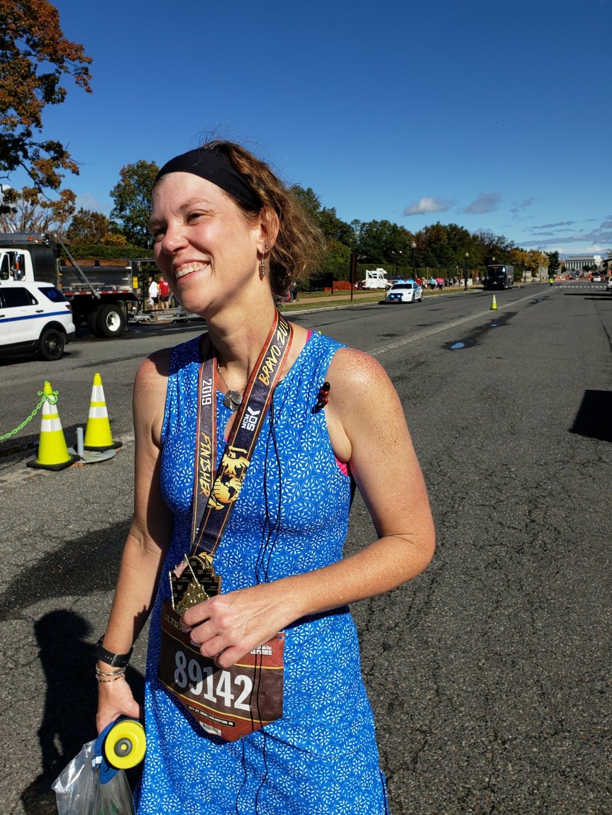 Departing the energy bubble of Crystal City, under three miles remained. I padded them out in a walk/run combo, and then picked up my pace to look good for the crowds gathered near Iwo Jima. I finished feeling strong, and somebody who I’d seen earlier on the route shouted “Go Fashionista!” since I was wearing a Nuu-Muu running dress. It was nice encouragement.