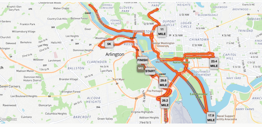 Marine Corps Marathon is a wall to wall running parade from start to finish. For a midpack runner like me, that means I’m constantly on the lookout to see if the person in front of me is going to weave, suddenly start walking, or veer over for a water stop. I was correct in my estimates about when the 50K runners would reunite with the marathoners and what it would mean for my pacing. I ran slower (not a lot slower, but slower) and went with it.