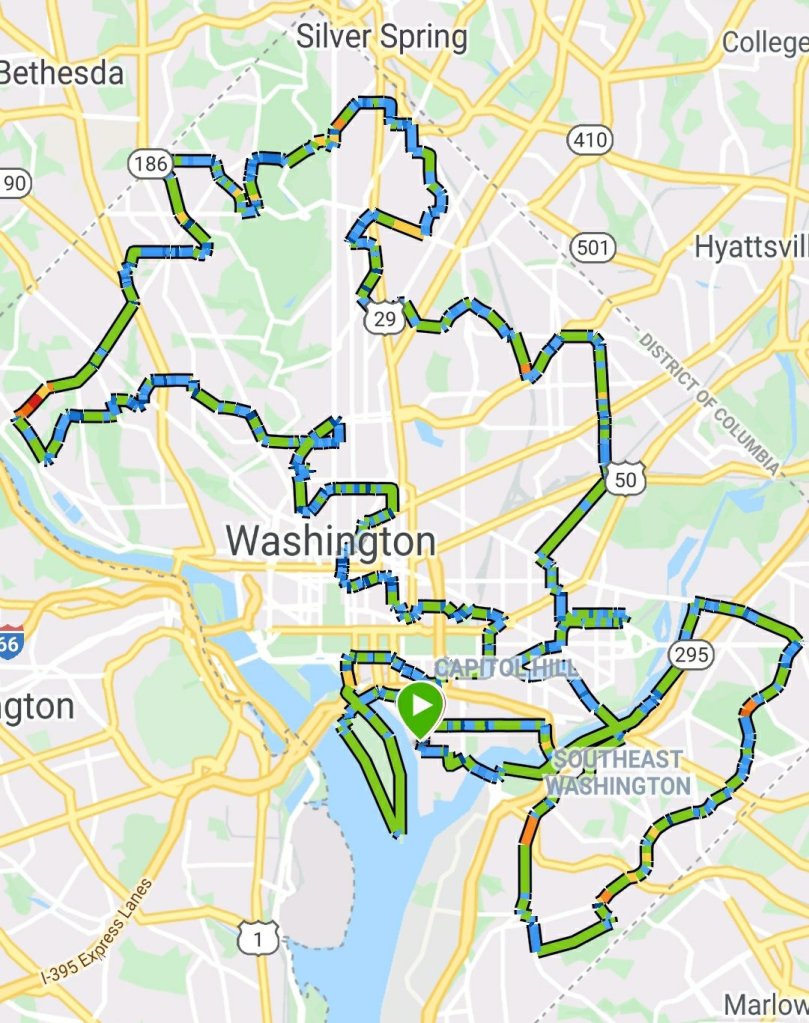 The reduced ridership and distributed start, both in terms of start windows and locations, meant that I didn’t spend 65 miles with the constant worry that I would run into someone else’s wheel or that someone would rear-end me. In addition, it was a treat to pop on over to Anacostia and begin, rather than roll to what has been the traditional start location in Adams Morgan.