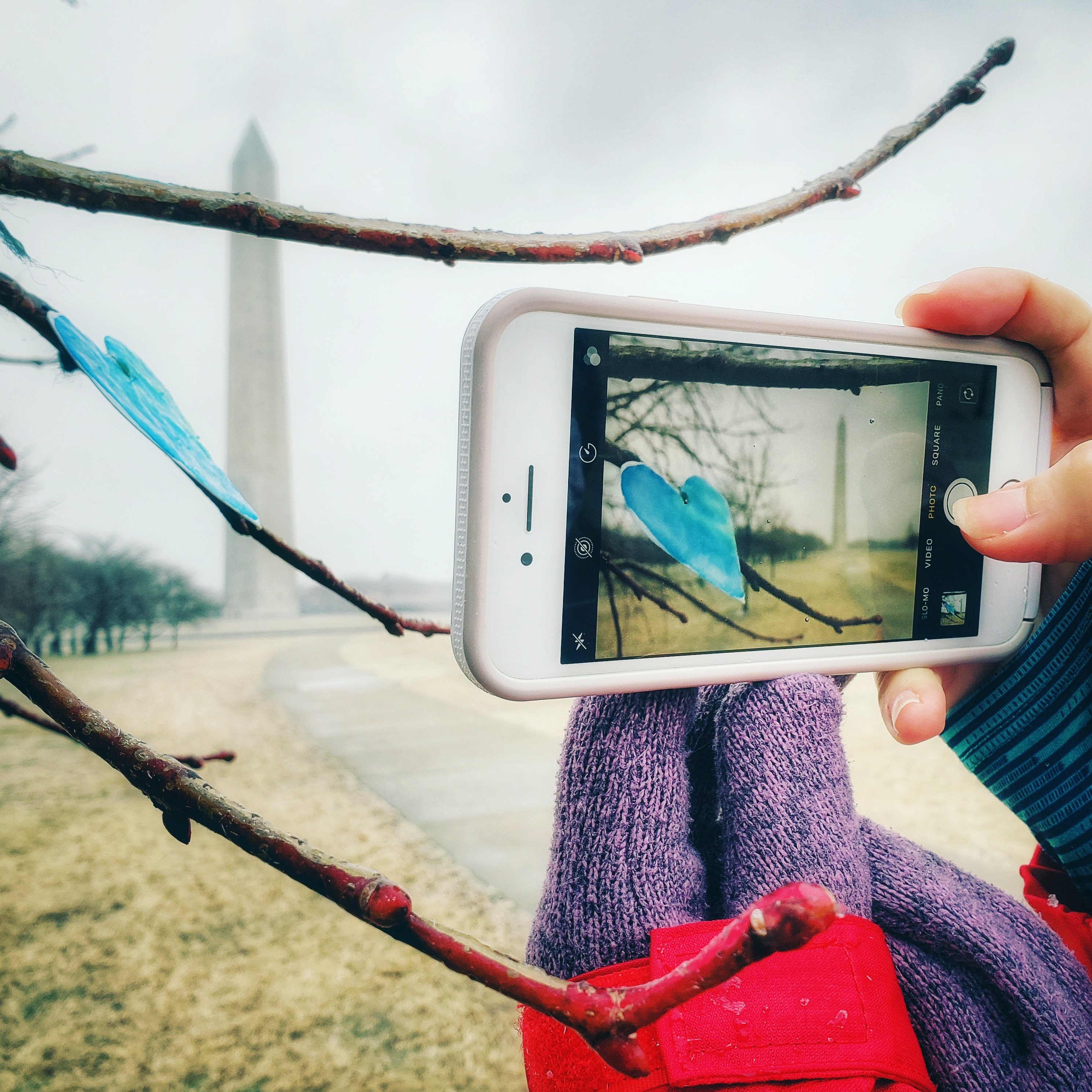 This weekend, C and I strolled out together into a day that offered cold, sleet, ice, and a bit of snow for atmosphere. As we made our way over to the Washington Monument, our eyes caught some little hearts that someone had affixed carefully to cherry tree branches. A subtle pop of color and love, cheer on a gray day.