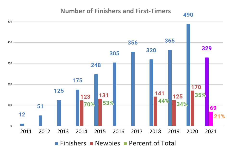 Looking at just the riders with 1, 2, or 3 years of completing these fall festivities, this group makes up more than 50% of all the riders this year. Hopefully they continue to find the experience joyful and keep their streaks alive!