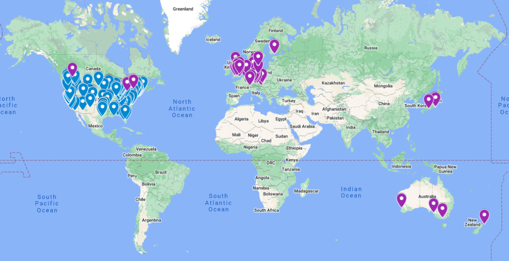 View the interactive map! US postal areas are blue markers, International spots are purple!
