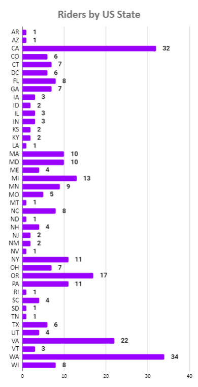That concludes most of the major statistics about who rode and where they are located, and there are still a handful of other things I’d like to dig into and talk about, but those will have to wait for another post. But I’ll leave you with these four data points: