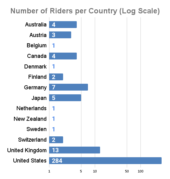 14 countries make it into the stats this year, and as usual the United States represents heavily with 86% of all riders. A new entrant brings New Zealand onto the chart for the first time! That makes 5 countries represented by a single rider, with 2 more countries showing up with 2 riders each. (The chart is a log scale, so check the horizontal axis before comparing countries.)