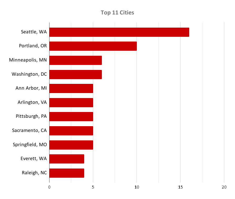 The chart below shows the top 11 cities for riders, with Ann Arbor, Springfield, and Everett showing up, placing quite high considering their smaller city populations. Overall a good mix of different cities across the country!