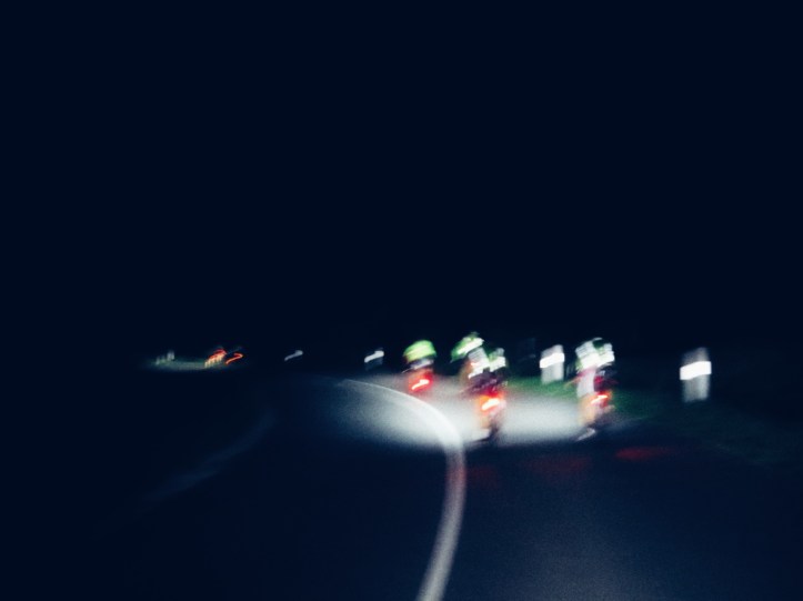 We are one. The stars, Felkerino, these riders, me. It doesn’t makes sense, yet nighttime has its own subset of rules and I embrace them.