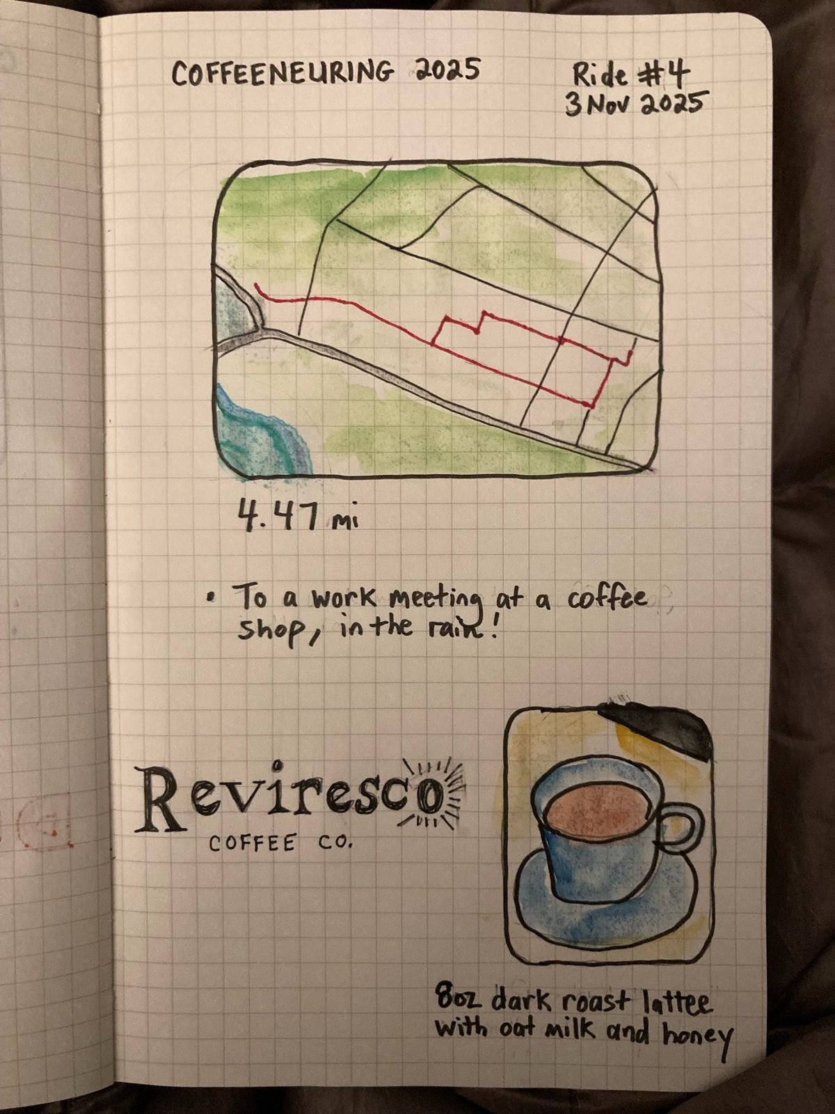 We love seeing all the creative ways that people take on this challenge. Jennifer B. is one of the coffeeneurs journaling her rides, and in this post she actually drew her Strava route. A little meta and so good!