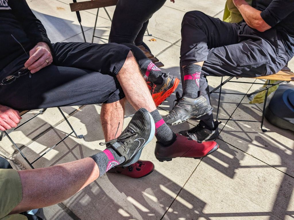 Warmer than expected, we drank coffee, ate Asian pears, and chatted the morning away. And about half of our group sported their coffeeneuring socks, see the evidence below.