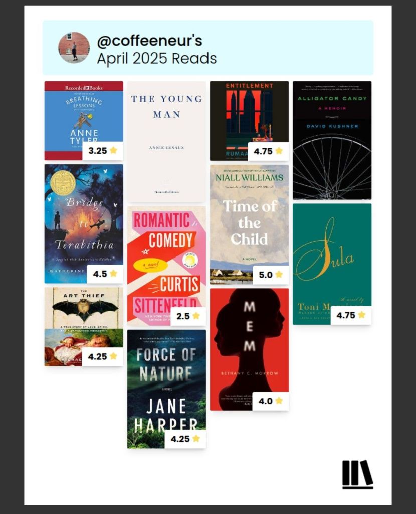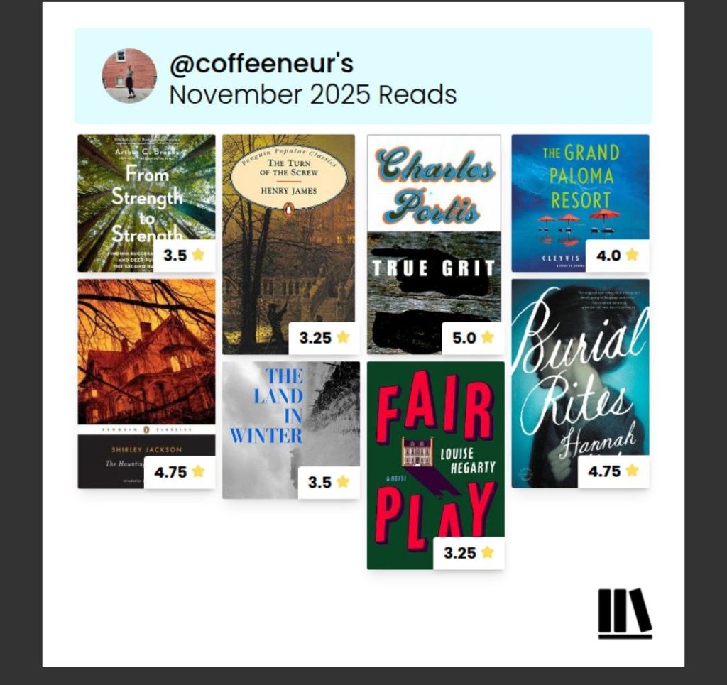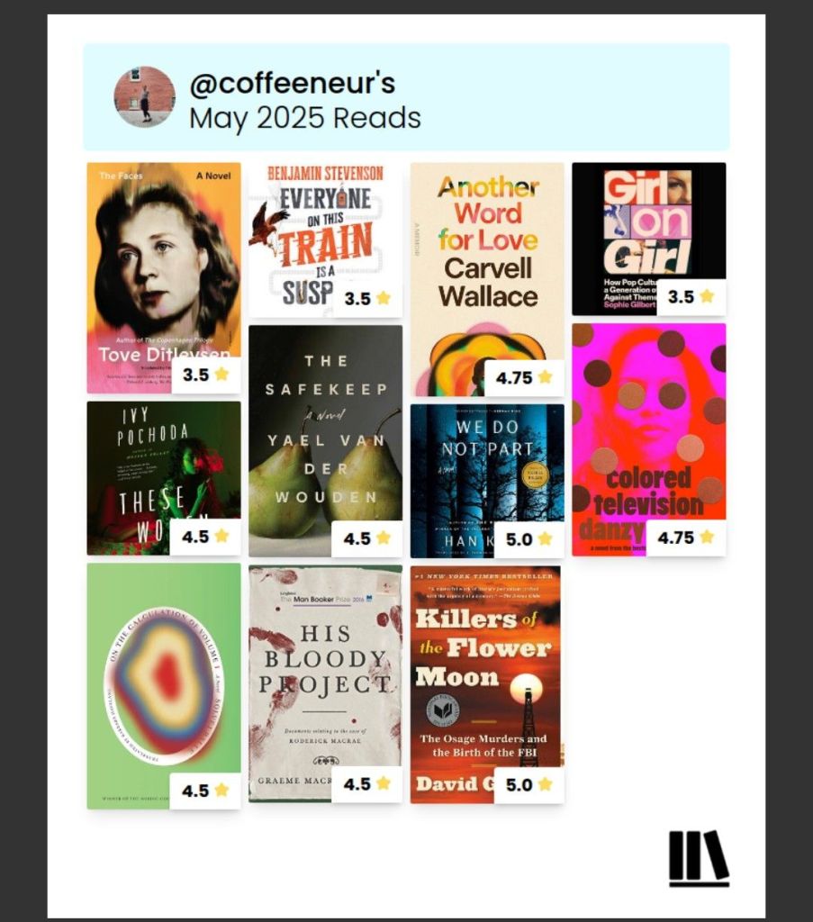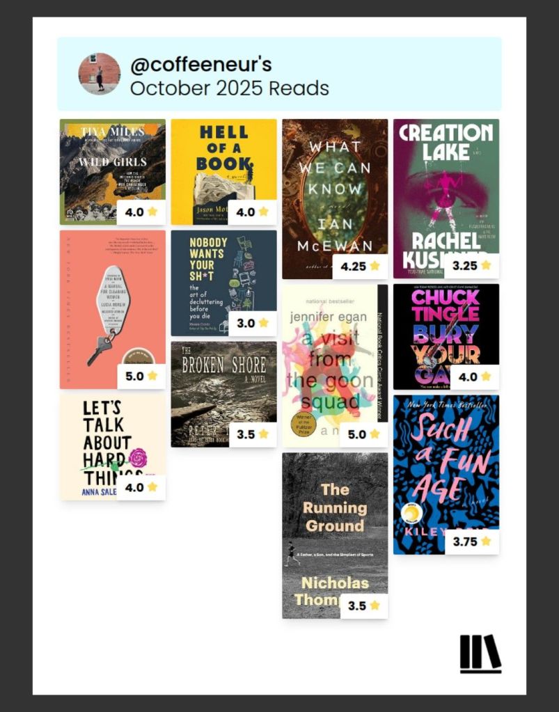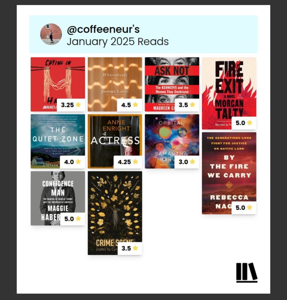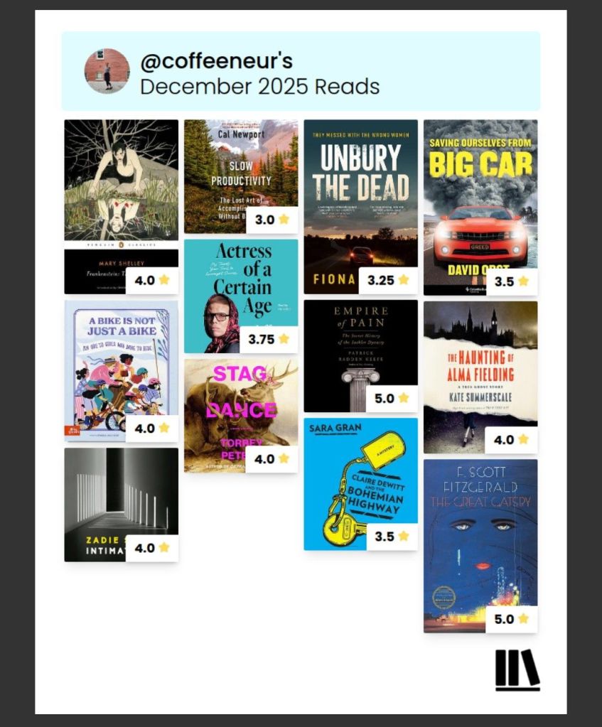 Are you part of Storygraph? I recommend it! Find me there as @coffeeneur (and I’m also on Goodreads here). Here is the graphic rundown – by month – of the 120 books I read in 2025.