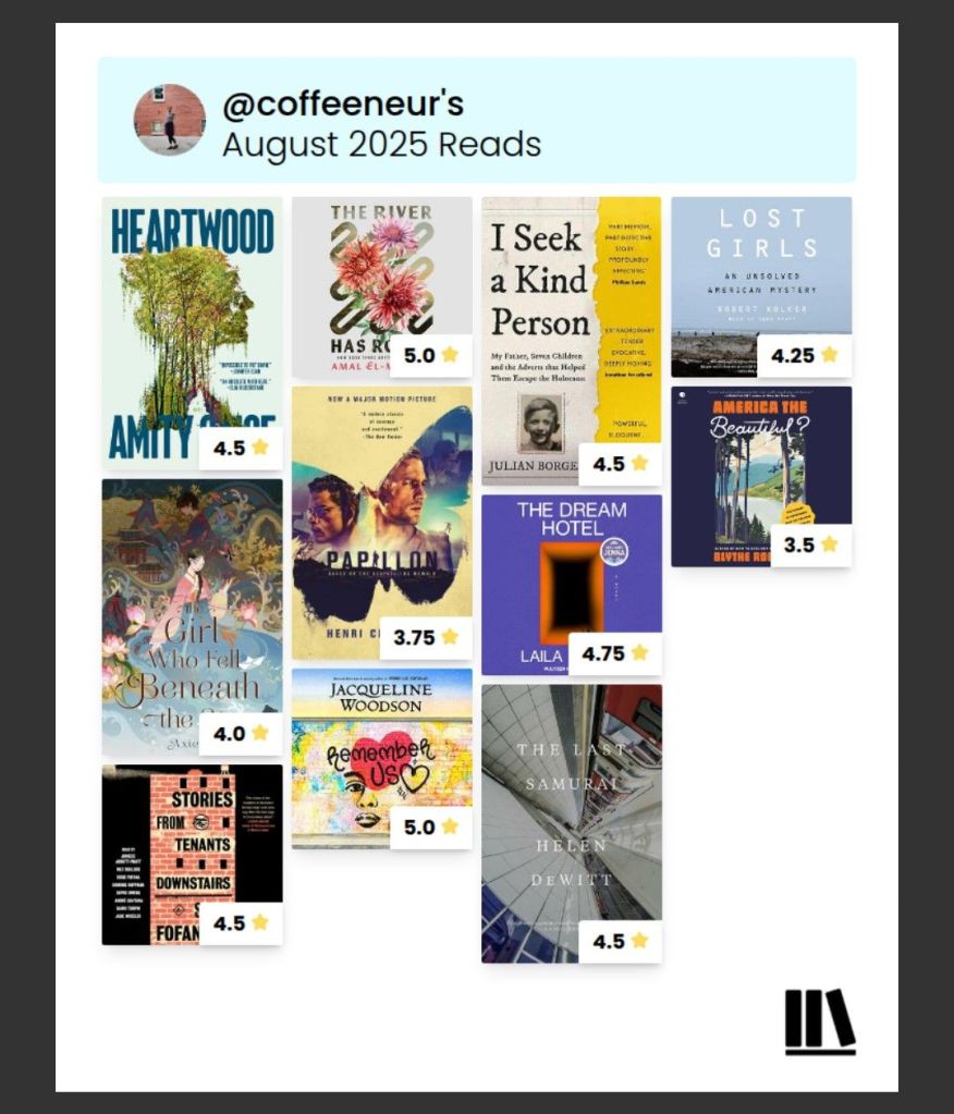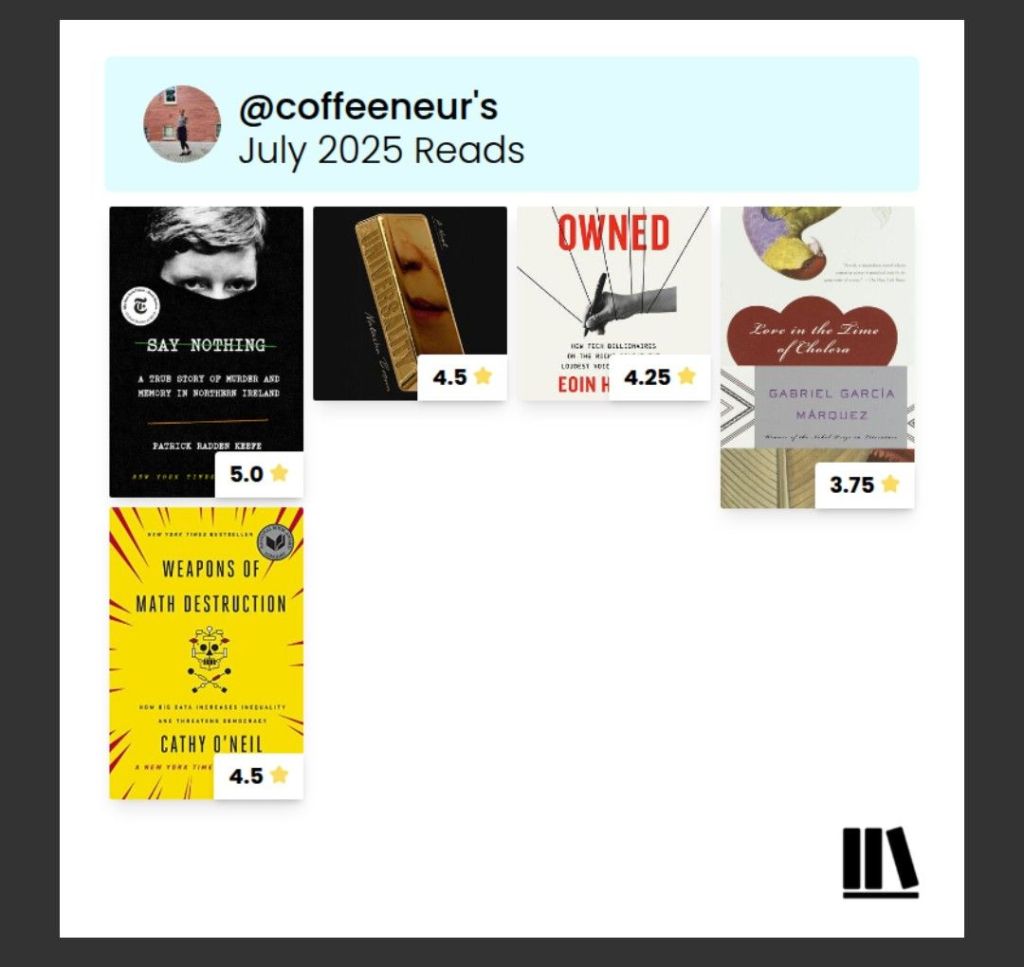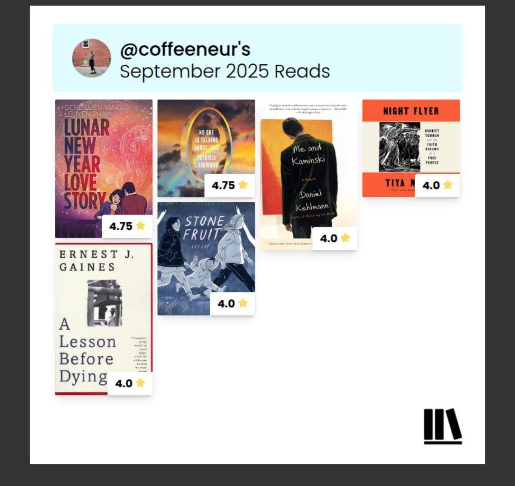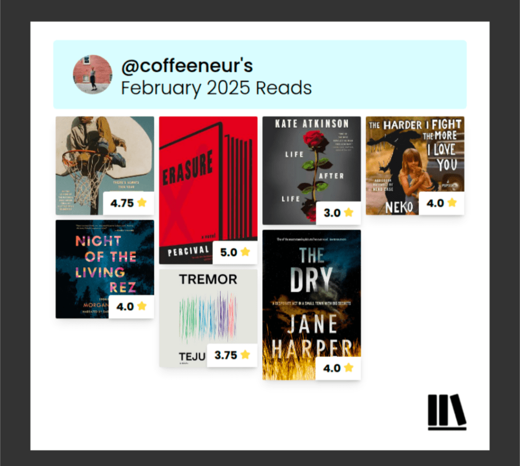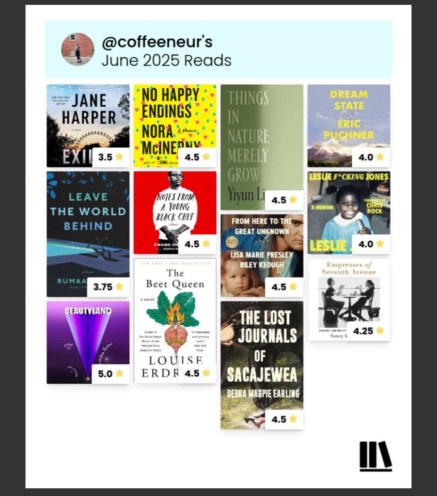 Are you part of Storygraph? I recommend it! Find me there as @coffeeneur (and I’m also on Goodreads here). Here is the graphic rundown – by month – of the 120 books I read in 2025.